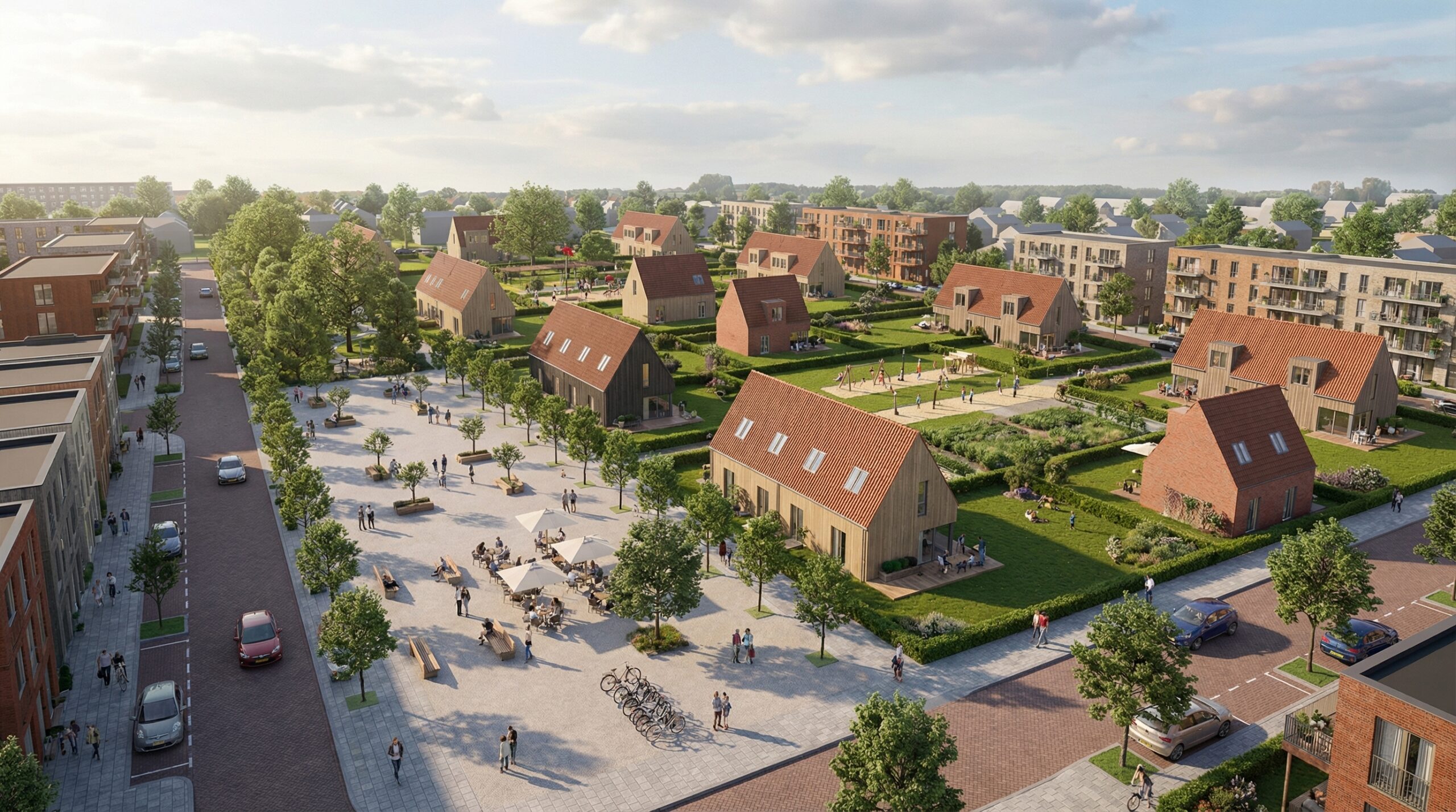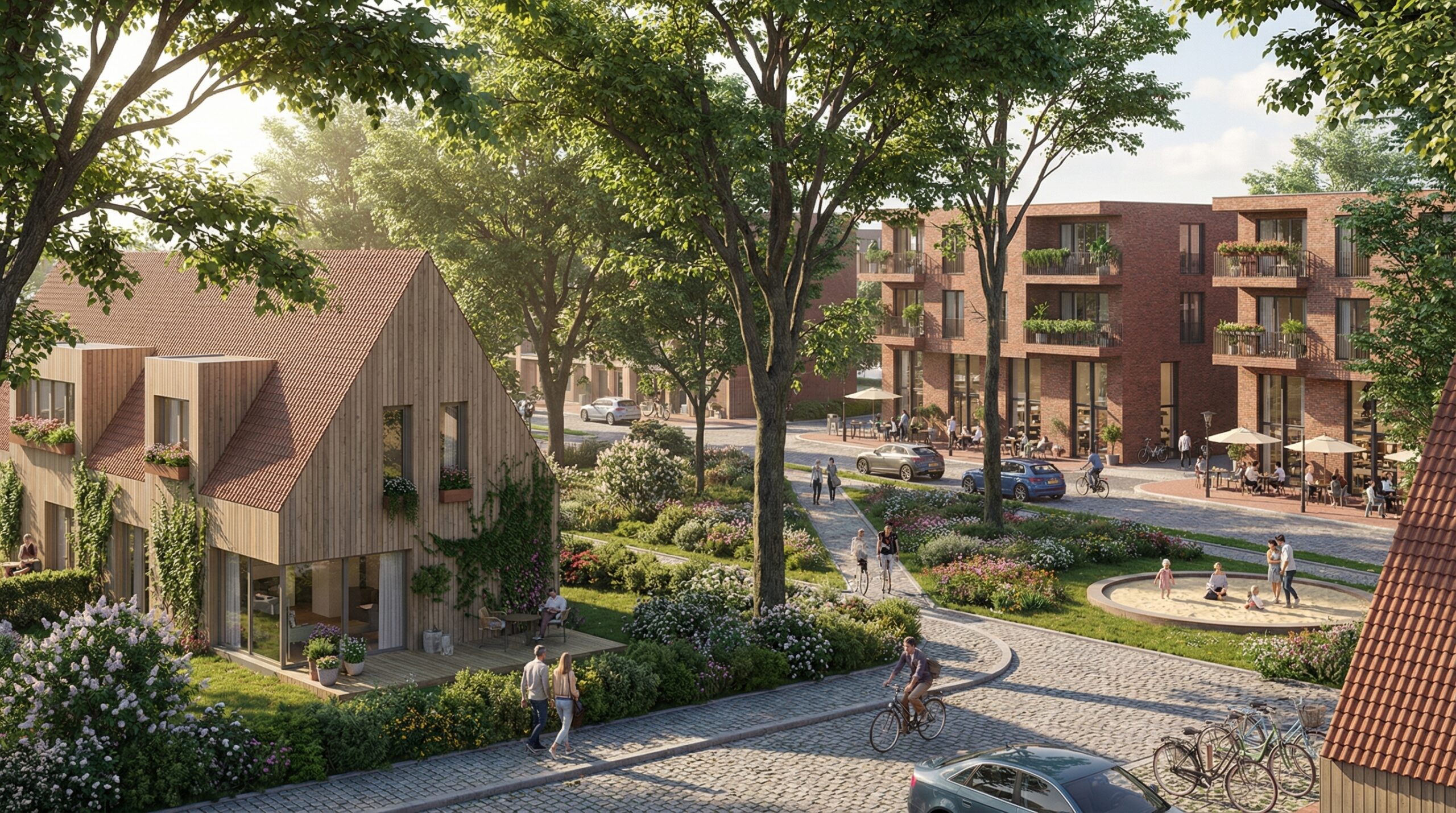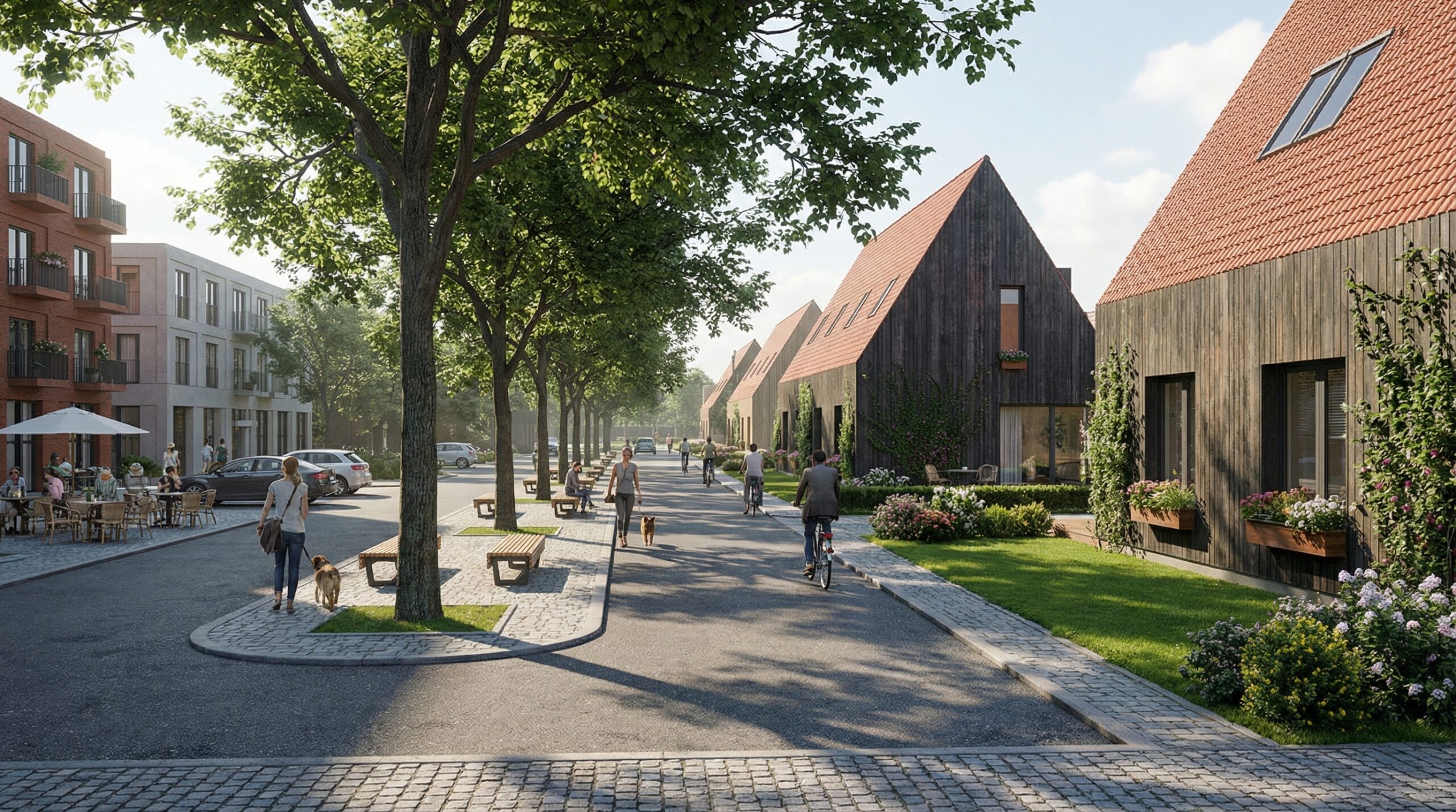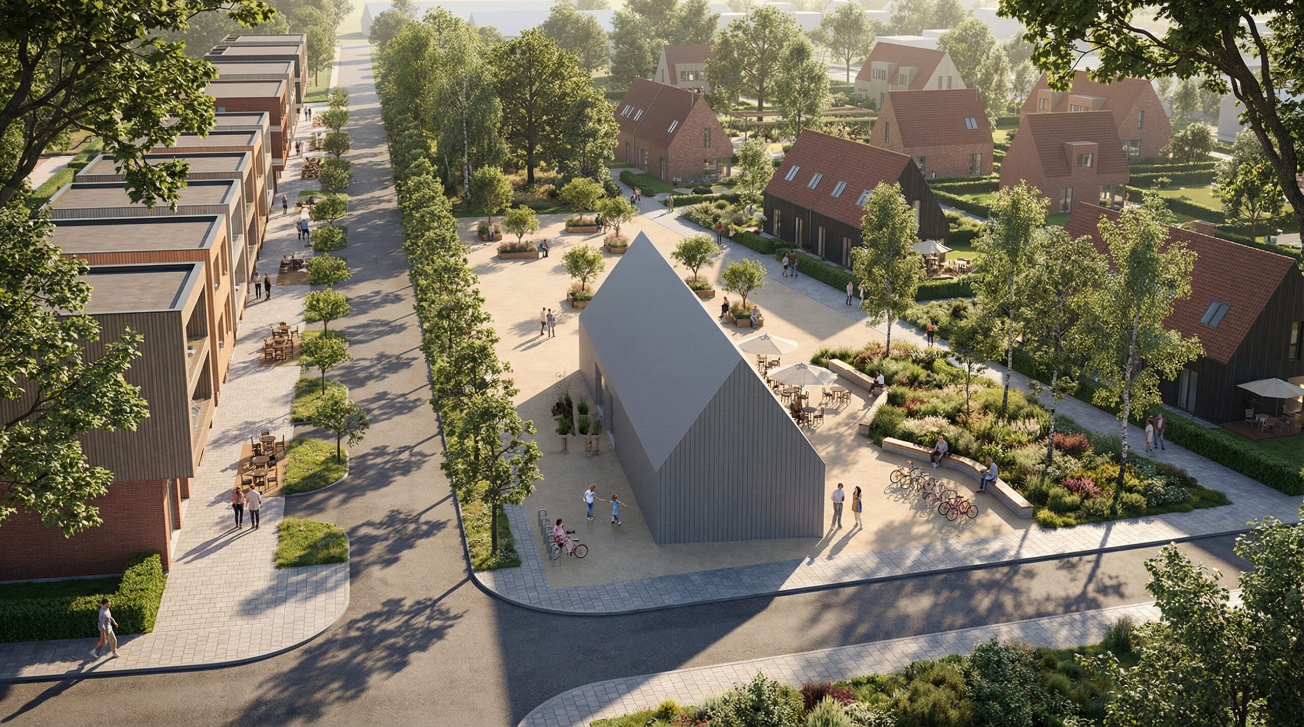 Kvartalo centrinės erdvės tampa kasdienio gyvenimo dalimi – vaikai žaidžia matomi iš namų, kaimynai susitinka bendrose zonose, o judėjimas vyksta ne tik gatvėmis, bet ir per bendruomenės erdves.