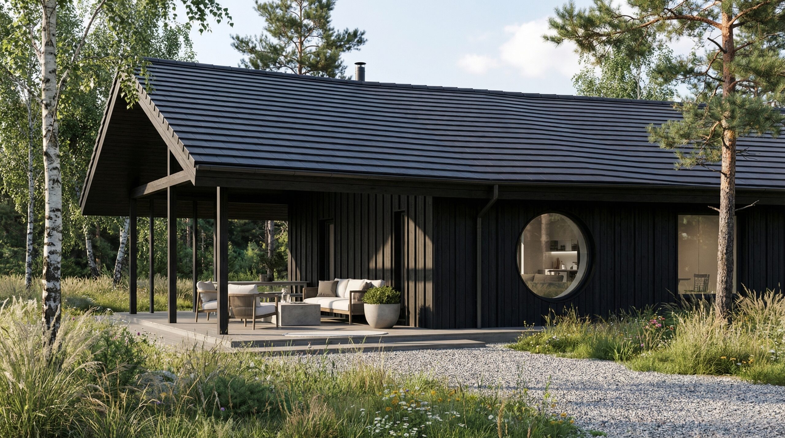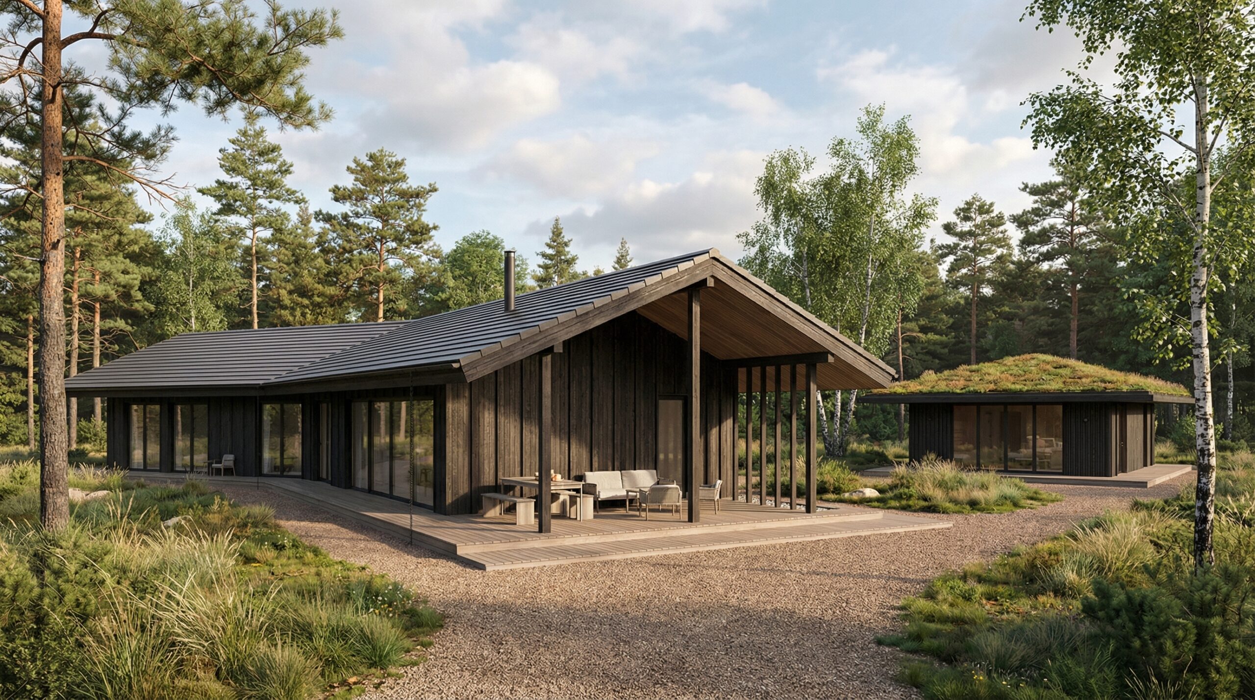Architektūrinė išraiška santūri ir lakoniška, orientuota į šiuolaikinę, „šiltos šiaurietiškos“ architektūros kryptį. Pagrindinis gyvenamasis namas išsiskiria pailga, laužyta forma ir dvišlaičiu stogu, kuris subtiliai interpretuoja tradicinę pastato tipologiją, tačiau perteikiamas šiuolaikinėmis proporcijomis ir detalėmis. Pirtis su žaliu stogu integruojama į aplinką dar labiau – ji suvokiama kaip kraštovaizdžio dalis, o ne atskiras statinys. Svečių namelis, esantis kiek atokiau, architektūriškai atkartoja pagrindinio namo mastelį ir medžiagiškumą, tačiau išlieka vizualiai ramesnis.