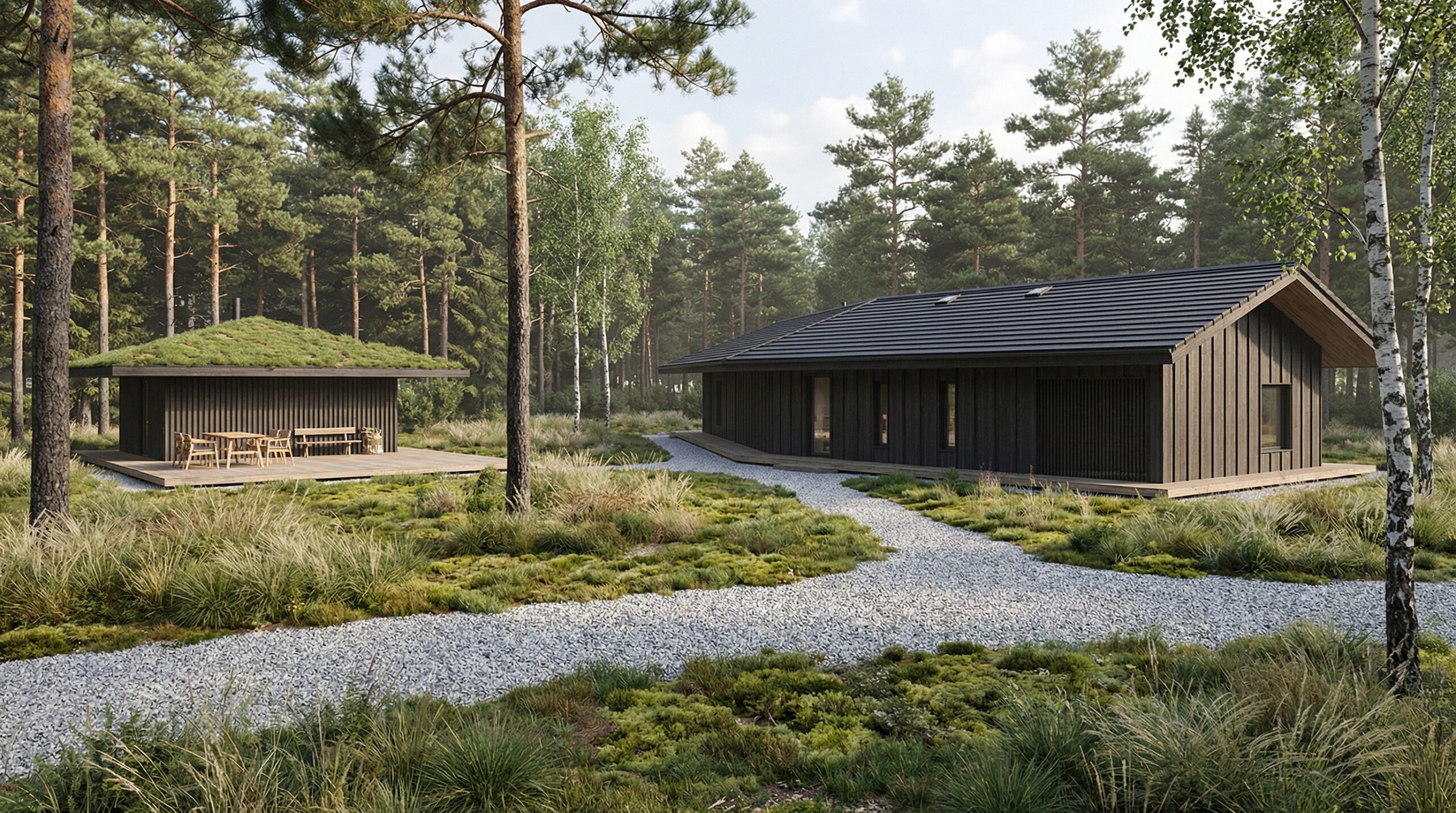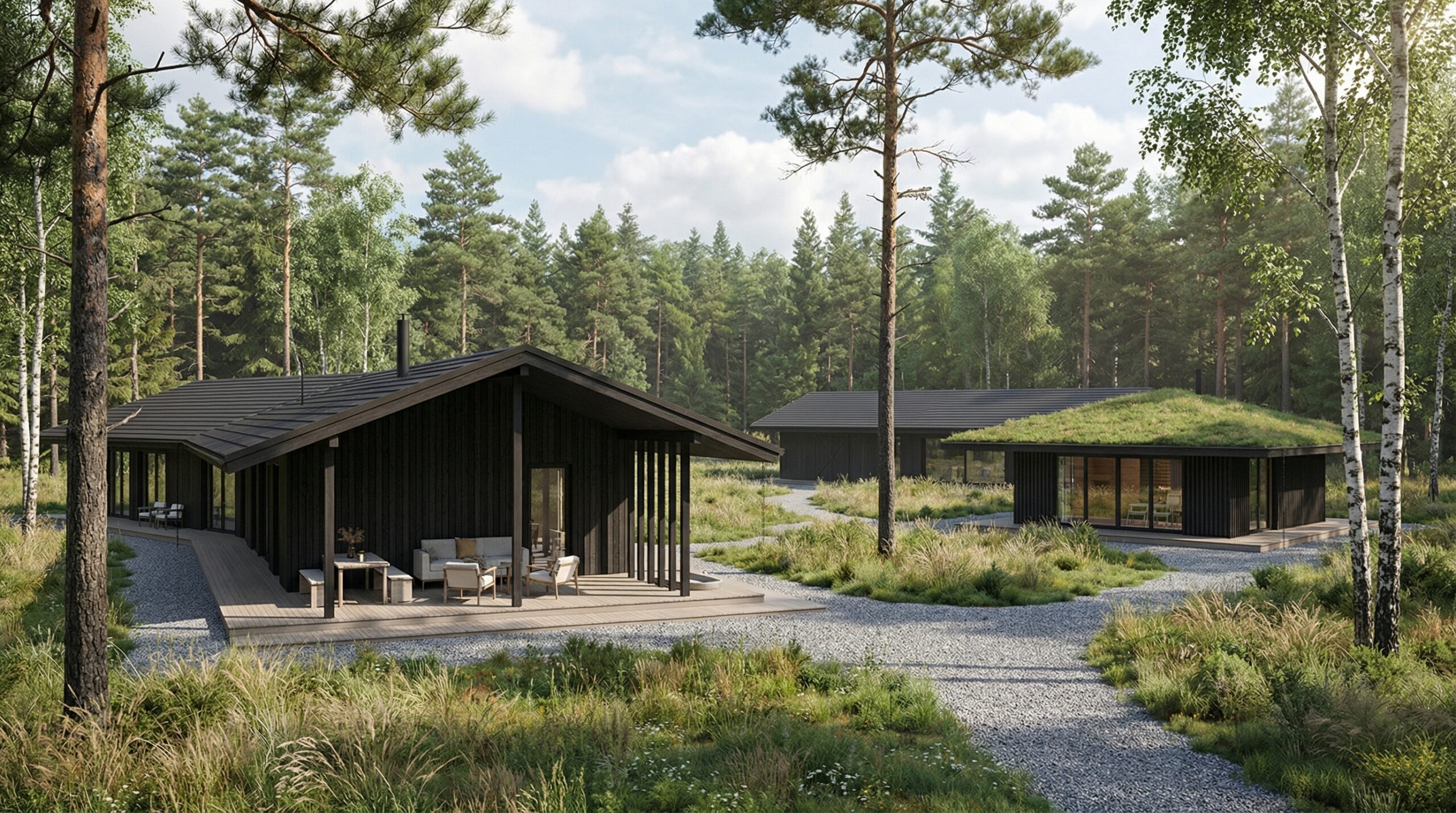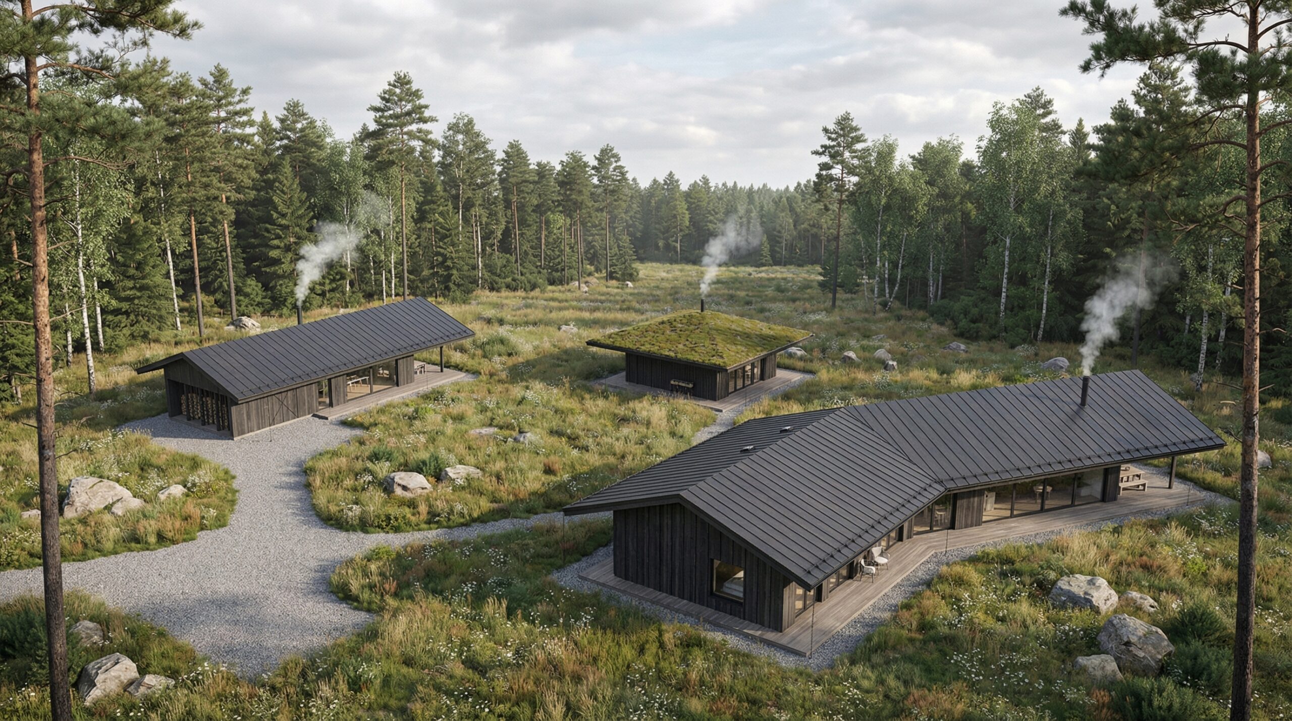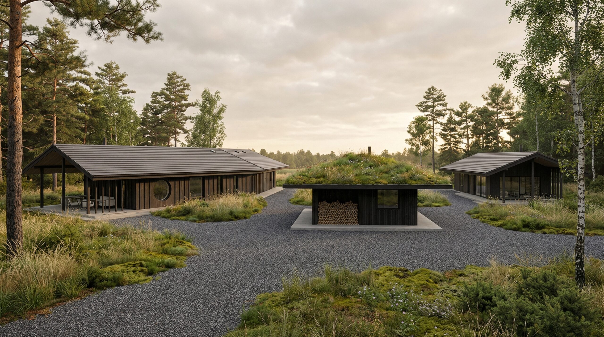 Visus pastatus jungia vingiuota privažiavimo ir takų sistema, kuri ne tik užtikrina patogų judėjimą sklype, bet ir formuoja minkštą, organišką erdvių perėjimą. Bendras sklypo planas orientuotas į funkcionalumą, privatumą ir aiškų zonų atskyrimą, kartu išlaikant harmoningą visų pastatų tarpusavio ryšį.