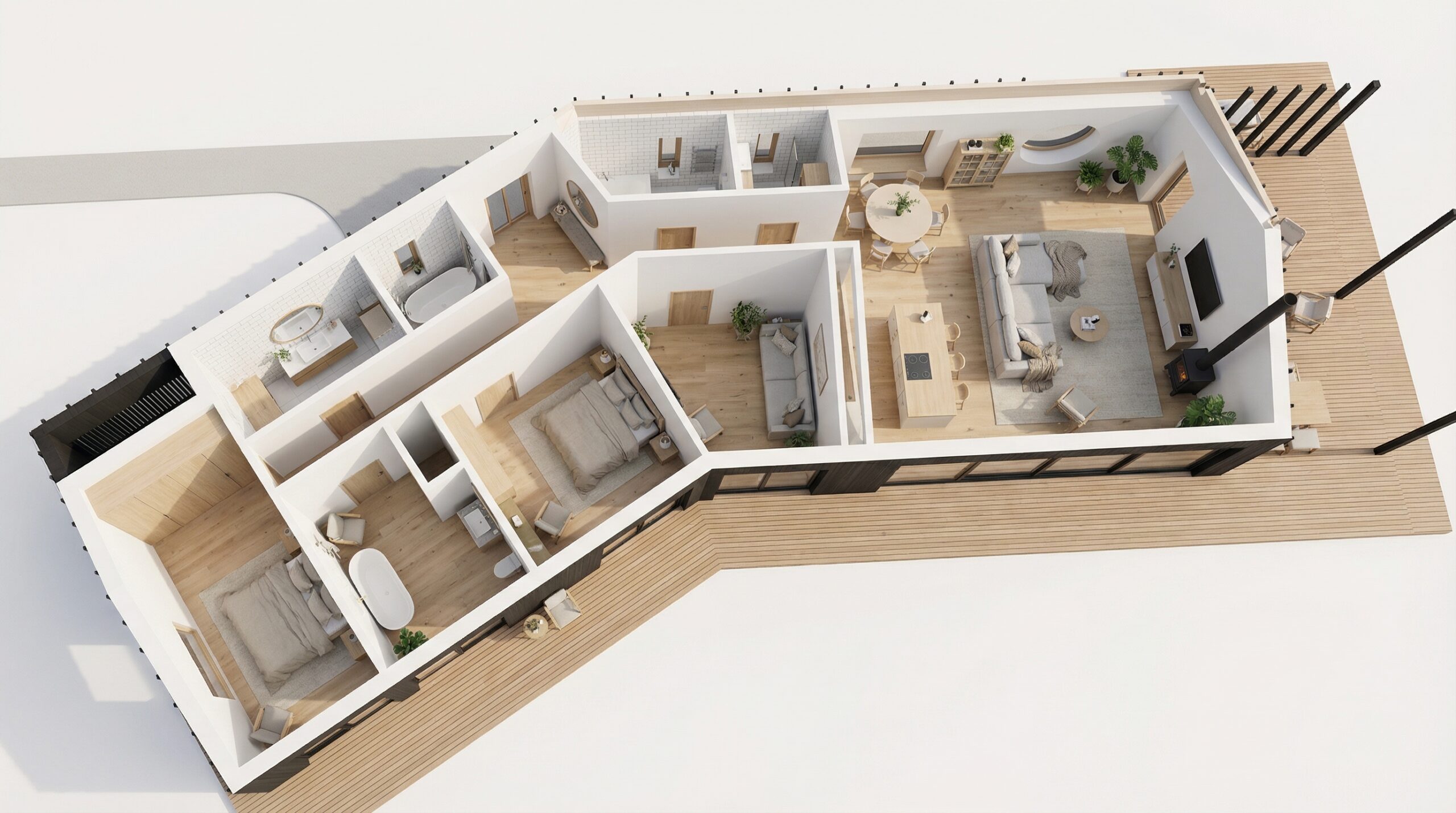 Pagrindinis namas yra vieno aukšto, pailgos, laužytos formos, suplanuotas taip, kad gyvenamosios ir poilsio erdvės būtų aiškiai atskirtos nuo miegamųjų zonos. Pagrindinis įėjimas veda į nedidelį holą, iš kurio patenkama į bendrąją namo dalį. Čia suformuota atvira svetainės, virtuvės ir valgomojo erdvė, pritaikyta kasdieniam šeimos gyvenimui ir svečių priėmimui. Virtuvė suprojektuota su sala, šalia numatyta valgomojo zona, o svetainė orientuota į didelius langus, kurie suteikia daug natūralios šviesos ir leidžia palaikyti ryšį su lauko erdve. Iš šios zonos patenkama į terasą, kuri tampa natūraliu vidaus erdvių tęsiniu šiltuoju metų laiku.